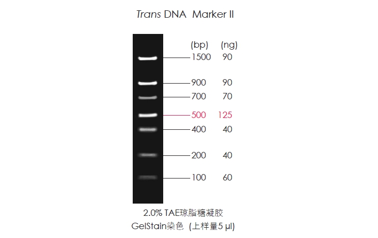 Trans DNA Maker II由7條線(xiàn)狀雙鏈DNA條帶組成,適用于瓊脂糖凝膠電泳中DNA條帶的分析,不建議用于聚丙烯酰胺凝膠電泳。本產(chǎn)品為即用型產(chǎn)品,已含有1×Loading Buffer,可根據(jù)實(shí)驗(yàn)需要,直接取5 μl電泳,使用方便,電泳圖像清晰。便于準(zhǔn)確判斷目的產(chǎn)物DNA的量。