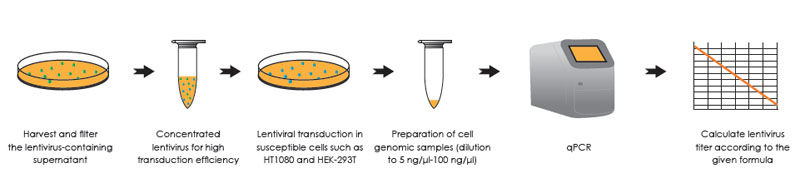 本產(chǎn)品提供了一種利用qPCR方法檢測慢病毒轉(zhuǎn)導細胞中整合的前病毒序列拷貝數(shù)的方法。慢病毒包裝后轉(zhuǎn)導易感細胞 (如HT1080,HEK-293T等),提取慢病毒轉(zhuǎn)導細胞基因組,進行qPCR反應,通過標準曲線Cq值計算整合的前病毒拷貝數(shù),進而得到確定的慢病毒滴度。