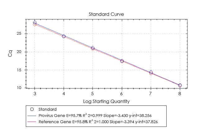 上圖表示Provirus Gene ( 藍色) 和Reference Gene ( 紅色) 以各標準品對應的Cq 值為縱坐標,相應拷貝數(shù)Log 值為橫坐標繪制的標準曲線,其中Provirus Gene R2= 1.000,擴增效率為97.1%;Reference Gene R2= 0.999,擴增效率為95.8%。