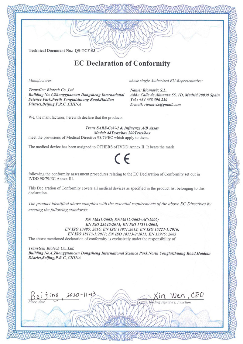 近日,全式金自主研發(fā)的新冠/甲乙流聯(lián)檢試劑盒(Trans SARS-CoV-2 & Influenze A/B Assay)完成歐盟CE認證,標志著我司產品符合歐盟相關指令的要求,已完成歐盟主管當局登記注冊,具備歐盟市場的準入條件。這是全式金在新型冠狀病毒(2019-nCoV)核酸檢測試劑盒取得CE認證后再次取得的突破。