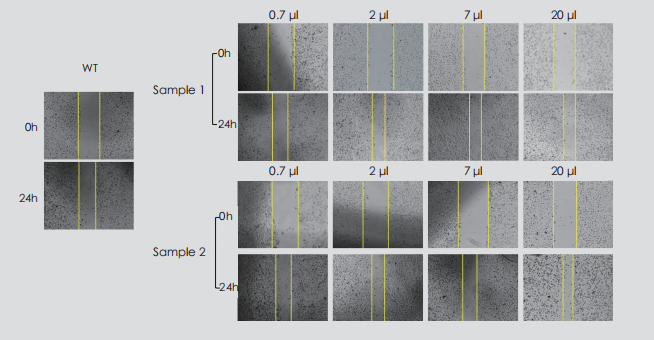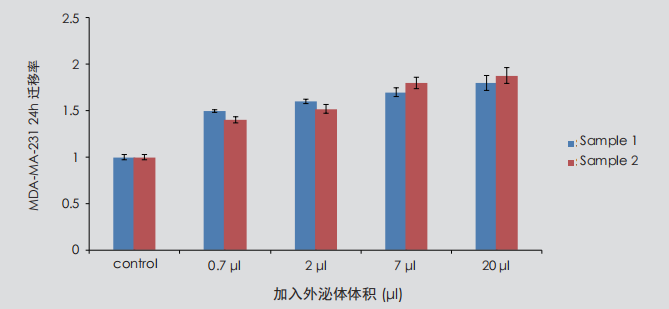 文獻(xiàn)(Harris et al., 2015)顯示MDA-MB-231細(xì)胞對(duì)從自身分泌的外泌體敏感,在加入從該細(xì)胞上清中提取出來(lái)的外泌體后,細(xì)胞遷移速度發(fā)生明顯改變。通過(guò)劃痕實(shí)驗(yàn)證明在 MDB-MA-231 細(xì)胞中,加入 TranGen 試劑盒所提取的外泌體后,細(xì)胞遷移率隨著加入外泌體的含量增加而提高,說(shuō)明所分離得到的外泌體具有活性,與文獻(xiàn)描述一致