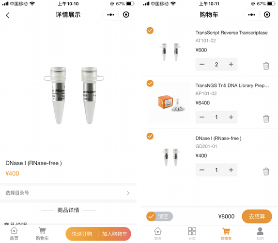 “全式金生物”是全式金依托微信小程序開(kāi)發(fā)的在線(xiàn)微商城系統(tǒng),可為科研工作者提供更好的在線(xiàn)服務(wù)。