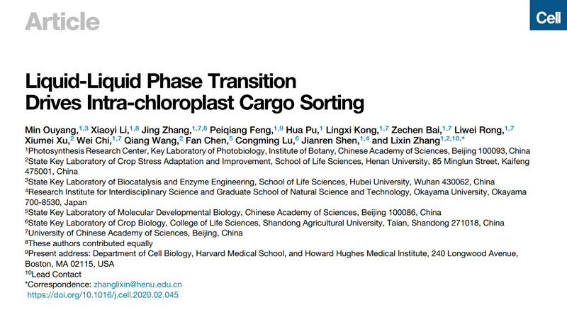 2020年3月12日,張立新教授研究團(tuán)隊(中國科學(xué)院植物研究所/河南大學(xué)生命科學(xué)學(xué)院)在Cell 發(fā)表了題為Liquid-Liquid Phase Transition Drives Intra-chloroplast Cargo Sorting的研究論文,首次提出并闡明了相分離驅(qū)動葉綠體內(nèi)蛋白分選的新機(jī)制。該研究發(fā)現(xiàn)了位于葉綠體基質(zhì)的關(guān)鍵蛋白轉(zhuǎn)運(yùn)分選因子STT1與STT2,闡明了雙精氨酸依賴轉(zhuǎn)運(yùn)途徑的底物識別、分選以及轉(zhuǎn)運(yùn)靶定到雙精氨酸依賴轉(zhuǎn)運(yùn)途徑的分子機(jī)制。