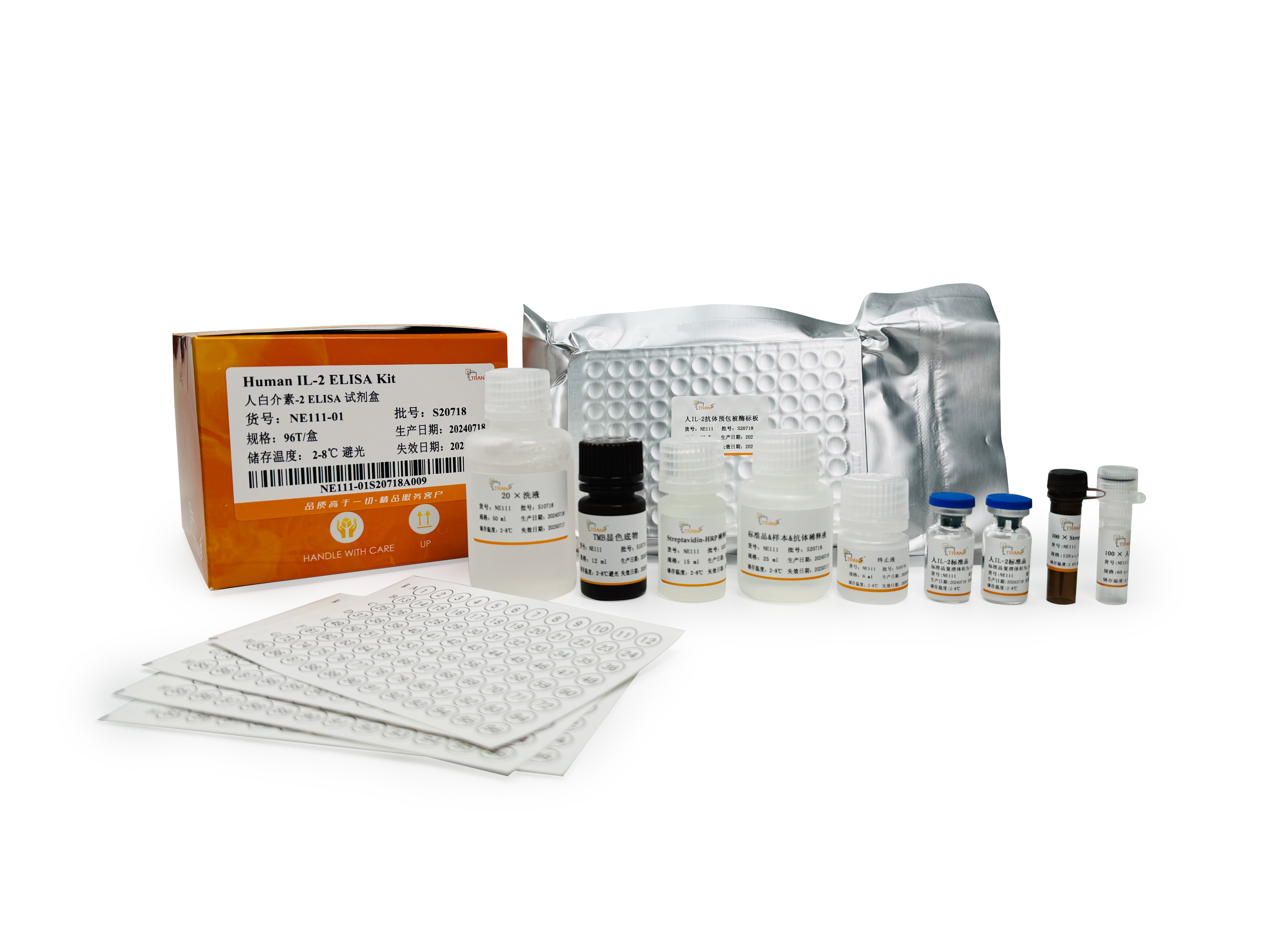 本試劑盒采用雙抗體夾心ELISA法定量測(cè)定人血清、血漿和細(xì)胞培養(yǎng)上清中的IL-2含量。本試劑盒采用高親和力的抗人IL-2抗體預(yù)包被酶標(biāo)板,將標(biāo)準(zhǔn)品/待測(cè)樣本和生物素標(biāo)記的抗人IL-2檢測(cè)抗體同步加入微板孔中,經(jīng)過孵育后樣本中存在的IL-2會(huì)與酶標(biāo)板上的預(yù)包被抗體和檢測(cè)抗體特異性結(jié)合。洗滌去除未結(jié)合物后,將辣根過氧化物酶標(biāo)記的鏈霉親和素(Streptavidin-HRP)加至微孔板中并孵育,通過檢測(cè)抗體上的生物素和鏈霉親和素發(fā)生的高強(qiáng)度非共價(jià)結(jié)合,形成“包被抗體-人IL-2蛋白-檢測(cè)抗體-Streptavidin-HRP”免疫復(fù)合物。再次洗滌后,將顯色底物TMB加至微板孔中,HRP會(huì)催化TMB底物生成藍(lán)色產(chǎn)物,顏色反應(yīng)的深淺將與樣本中IL-2的濃度成正相關(guān)。而后加入終止液終止反應(yīng),在450 nm波長(參考波長570 - 630 nm)處測(cè)定吸光度值。通過繪制標(biāo)準(zhǔn)曲線,由樣本吸光度值可計(jì)算出樣本中所含IL-2濃度。本試劑盒特異性強(qiáng)、檢測(cè)靈敏度高,同時(shí)操作更加便捷。