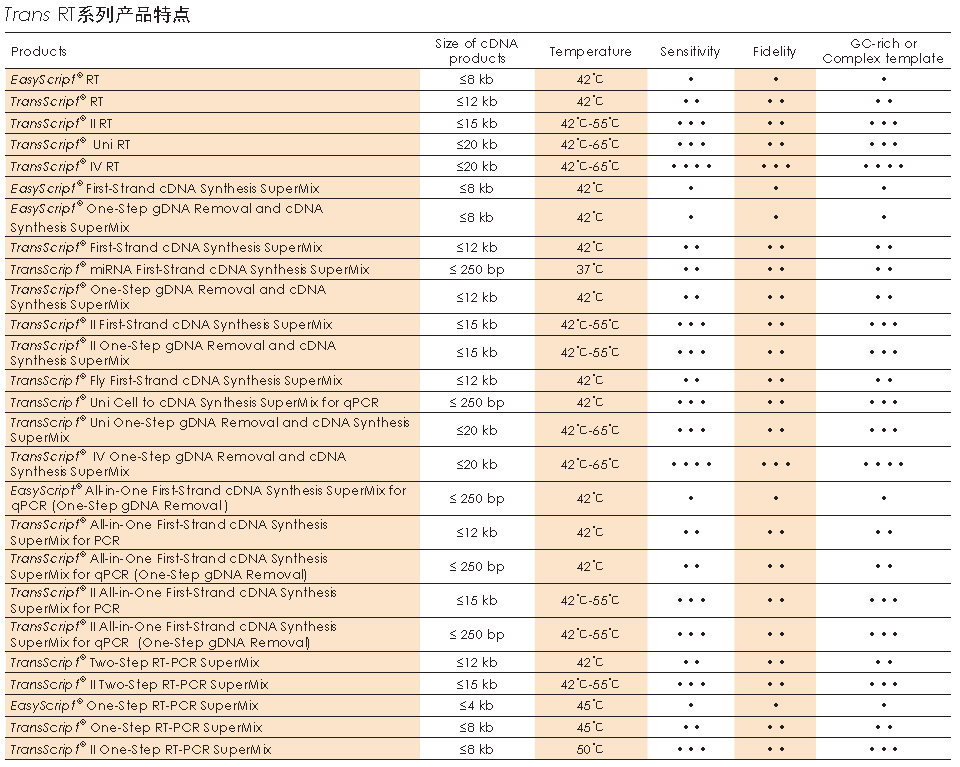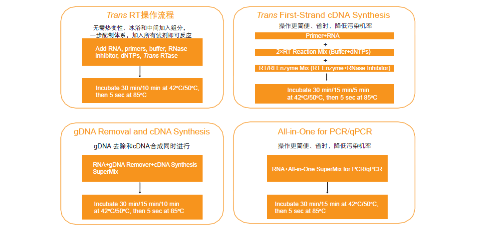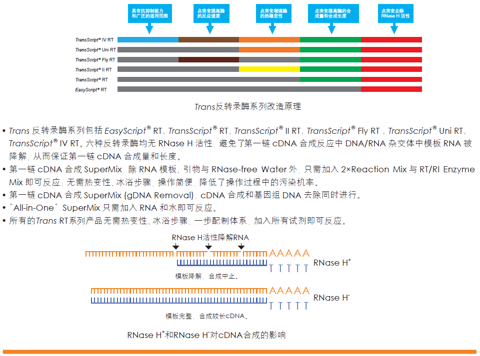 本產(chǎn)品含有反轉(zhuǎn)錄反應(yīng)所需的全部試劑(TransScript? RT, RNase Inhibitor, Anchored Oligo(dT)18 Primer, Random Primer(N9), dNTPs, Buffer),濃度為5×。反應(yīng)時(shí),只需加入gDNA Remover、模板RNA和水即可高效地合成第一鏈cDNA,同時(shí)去除RNA模板中殘留的基因組DNA。另配有5×TransScript? All-in-One No-RT Control SuperMix for qPCR,用于配制無(wú)反轉(zhuǎn)錄酶的對(duì)照,判斷qPCR模板是否來(lái)自cDNA。該產(chǎn)品操作簡(jiǎn)便,降低操作過(guò)程中的污染機(jī)率。cDNA只適用于qPCR,不適用于常規(guī)PCR。