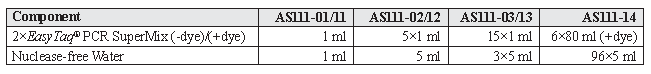 本產品包含EasyTaq? DNA Polymerase、dNTPs和優(yōu)化的反應緩沖液,濃度為2×。DNA擴增時,只需加入模板、引物和水,使SuperMix溶液的濃度為1×即可進行反應。擴增產物3' 端帶“A”堿基,2×EasyTaq? PCR SuperMix (-dye) 擴增產物可直接克隆于pEASY?-T系列載體中;2×EasyTaq? PCR SuperMix (+dye) 擴增產物可直接點樣電泳,如用于克隆,需純化去掉染料。其PCR產物不適用于聚丙烯酰胺凝膠電泳。