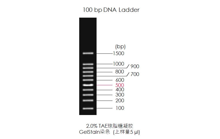 100bp DNA Ladder是由11條線狀雙鏈DNA條帶組成,適用于瓊脂糖凝膠電泳中DNA條帶的分析,不建議用于聚丙烯酰胺凝膠電泳。本產(chǎn)品為即用型產(chǎn)品,已含有1×Loading Buffer,可根據(jù)實(shí)驗(yàn)需要,直接取5 μl電泳,使用方便,電泳圖像清晰。其中500 bp條帶濃度為100 ng/5 μl,顯示亮帶,其余條帶濃度均為50 ng/5 μl。便于準(zhǔn)確判斷目的產(chǎn)物DNA的量。