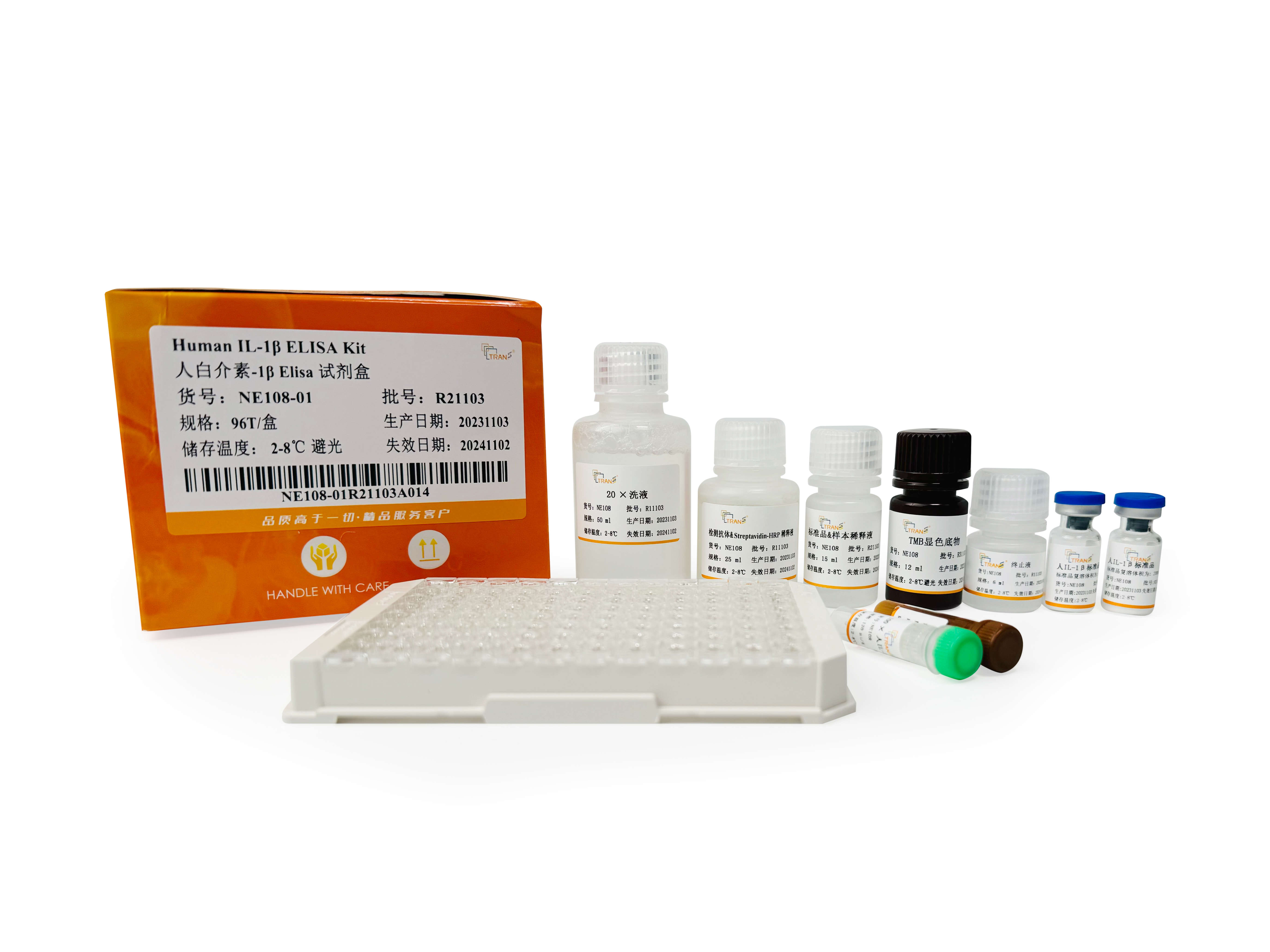 本試劑盒采用雙抗體夾心ELISA法定量測定人血清、血漿和細(xì)胞培養(yǎng)上清中的IL-1β含量。本試劑盒采用高親和力的抗人IL-1β抗體預(yù)包被酶標(biāo)板,將標(biāo)準(zhǔn)品/待測樣本加入微板孔中,經(jīng)過孵育后樣本中存在的IL-1β會(huì)與酶標(biāo)板上的預(yù)包被抗體特異性結(jié)合。洗滌去除未結(jié)合物后,將生物素標(biāo)記的抗人IL-1β檢測抗體加入微板孔中,再次孵育后檢測抗體會(huì)與錨定在酶標(biāo)板上的IL-1β特異性結(jié)合。隨后,將辣根過氧化物酶標(biāo)記的鏈霉親和素(Streptavidin-HRP)加至微孔板中并孵育,通過檢測抗體上的生物素和鏈霉親和素發(fā)生的高強(qiáng)度非共價(jià)結(jié)合,形成“包被抗體-人IL-1β蛋白-檢測抗體-Streptavidin-HRP”免疫復(fù)合物。再次洗滌后,將顯色底物TMB加至微板孔中,HRP會(huì)催化TMB底物生成藍(lán)色產(chǎn)物,顏色反應(yīng)的深淺將與樣本中IL-1β的濃度成正相關(guān)。而后加入終止液終止反應(yīng),在450 nm波長(參考波長570 - 630 nm)處測定吸光度值。通過繪制標(biāo)準(zhǔn)曲線,由樣本吸光度值可計(jì)算出樣本中所含IL-1β濃度。本試劑盒特異性強(qiáng)、檢測靈敏度高,同時(shí)操作更加便捷。