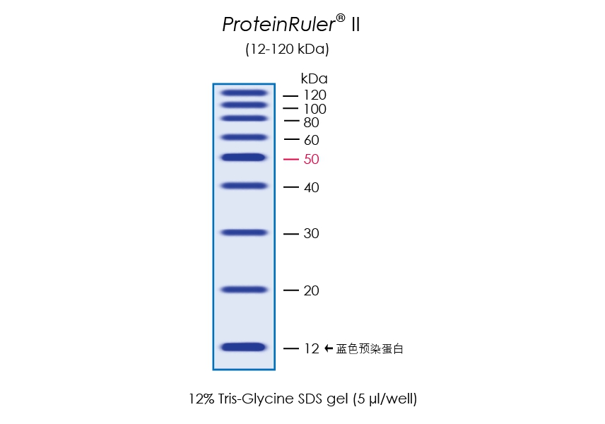 ProteinRuler? II由9種重組蛋白質(zhì)組成,分子量范圍為12 kDa-120 kDa。經(jīng)SDS-PAGE電泳后,用考馬斯亮藍(lán)染色可見清晰的9條帶。12 kDa為藍(lán)色預(yù)染蛋白,便于動態(tài)觀察蛋白質(zhì)電泳狀態(tài)。50 kDa為加亮條帶,便于分子量鑒定。